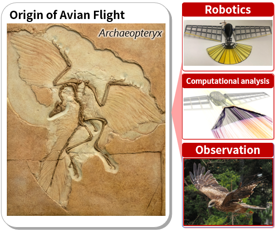 Tools that aid our understanding of biological flight—such as simulation and robotics—can also help us interpret the flight of extinct organisms, for which only fragmentary information remains. For example, the origin of avian flight remains a highly intriguing topic of ongoing debate. Regarding Archaeopteryx, the oldest known bird, a variety of hypotheses have been proposed based on skeletal fossils and comparisons with living birds. However, because its skeleton differs markedly from that of modern birds, each hypothesis faces counterarguments and no consensus has been reached. In this project, using fossil-based information as a starting point, I will make full use of “mechanics” and “robotics”—the tools I have employed to understand biological flight—to decode how Archaeopteryx flew. In the course of this effort, we may uncover flight modes that are fundamentally different from those currently known, yielding insights with potential value for engineering as well.